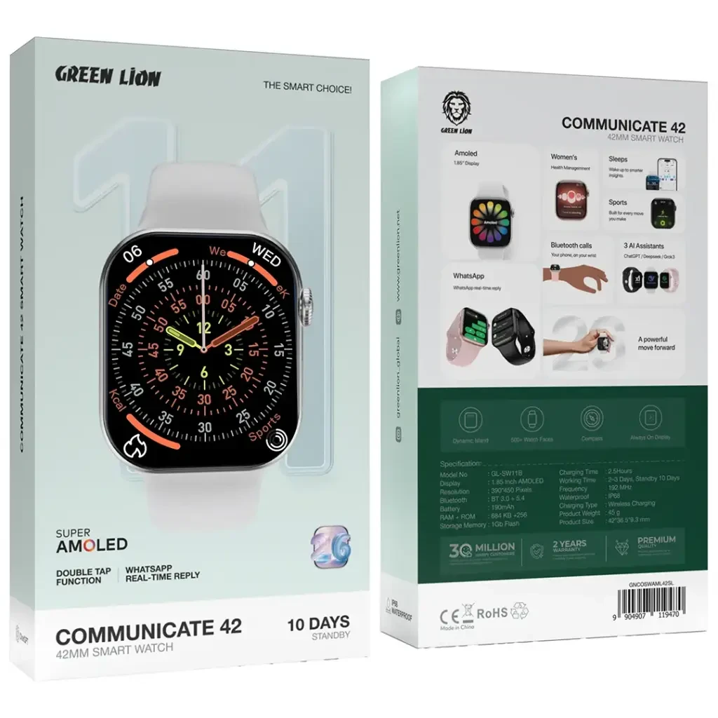 The 190mAh battery delivers 2–3 days of working time and up to 10 days of standby, supported by wireless charging for convenience. Built with IP68 water resistance, always-on display, compass, and 500+ watch faces, the Green Lion Communicate 42 is ideal for users who want a smartwatch that blends style, durability, and smart functionality.